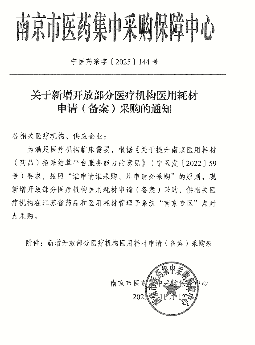 宁医药采字〔2025〕144号—关于新增开放部分医疗机构医用耗材申请(备案)采购的通知