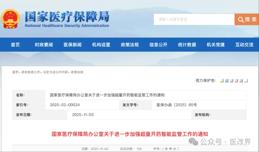 11月3日,国家医保局发布《国家医疗保障局办公室关于进一步加强超量开药智能监管工作的通知》,要求加强超量开药智能监管。