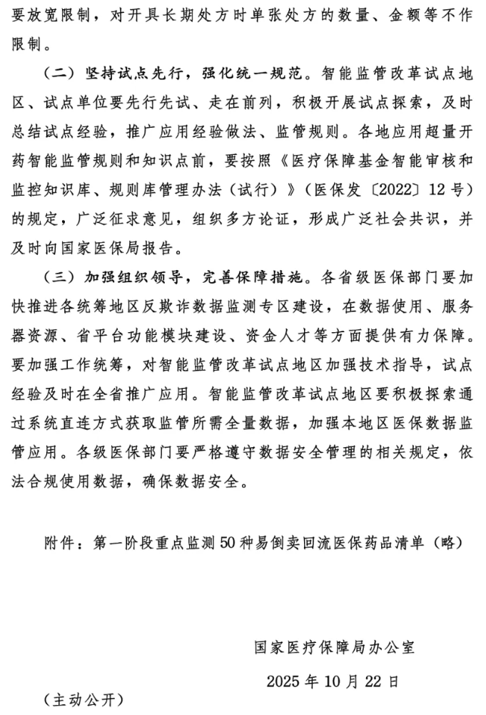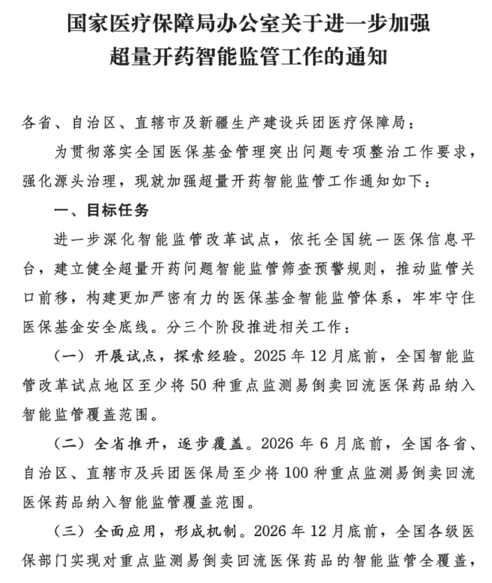 (一)开展试点,探索经验。2025年12月底前,全国智能监管改革试点地区至少将50种重点监测易倒卖回流医保药品纳入智能监管覆盖范围。