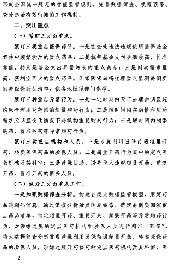 (三)全面应用,形成机制。2026年12月底前,全国各级医保部门实现对重点监测易倒卖回流医保药品的智能监管全覆盖,形成全国统一规范的智能监管规则,完善数据筛查、提醒预警、查处惩治有效衔接的工作机制。
