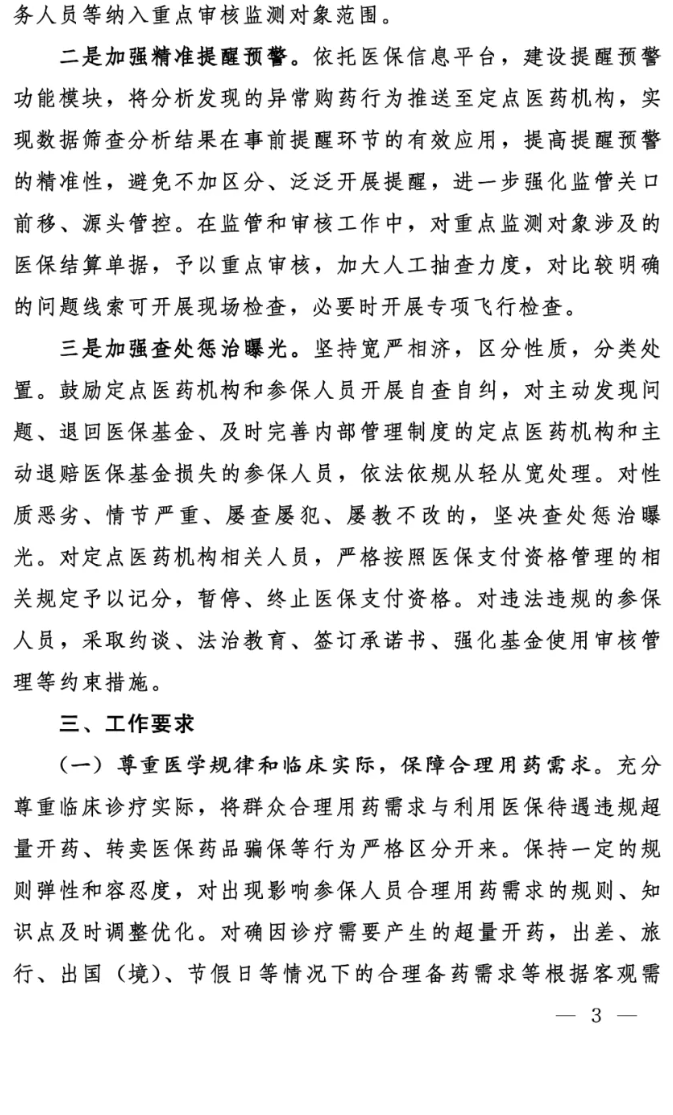 二是加强精准提醒预警。依托医保信息平台,建设提醒预警功能模块,将分析发现的异常购药行为推送至定点医药机构,实现数据筛查分析结果在事前提醒环节的有效应用,提高提醒预警的精准性,避免不加区分、泛泛开展提醒,进一步强化监管关口前移、源头管控。在监管和审核工作中,对重点监测对象涉及的医保结算单据,予以重点审核,加大人工抽查力度,对比较明确的问题线索可开展现场检查,必要时开展专项飞行检查。