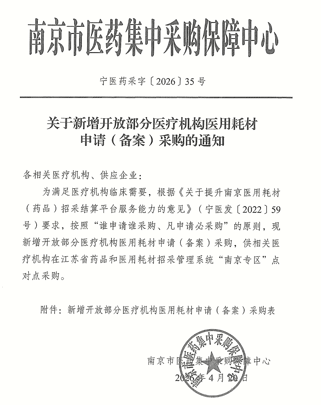 宁医药采字〔2026〕35号—关于新增开放部分医疗机构医用耗材申请(备案)采购的通知