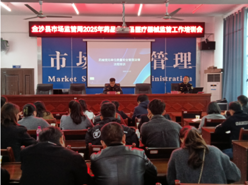 为强化金沙县药品化妆品医疗器械监督管理工作,进一步规范药品医疗器械经营使用环节的质量管理行为,提高药品化妆品医疗器械安全性监测工作能力。2025年11月12日,由金沙县市场监督管理局举办的2025年药品化妆品医疗器械监管工作培训班在局八楼会议室开班,局党组成员、综合行政执法大队大队长夏金中出席开班仪式并作重要讲话,县直各医疗卫生单位、社区卫生服务中心、各乡(镇、街道)卫生院、民营医疗机构等单位从事药品化妆品医疗器械安全性监测专(兼)职人员70余人参加培训。
