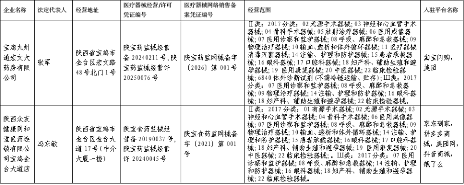 根据《医疗器械监督管理条例》《医疗器械经营监督管理办法》和《医疗器械网络销售监督管理办法》等规定,现对宝鸡九州通宏文大药房有限公司、陕西众友健康同和堂医药连锁有限公司宝鸡金台大道店的医疗器械网络销售备案信息予以公示(首次备案)。