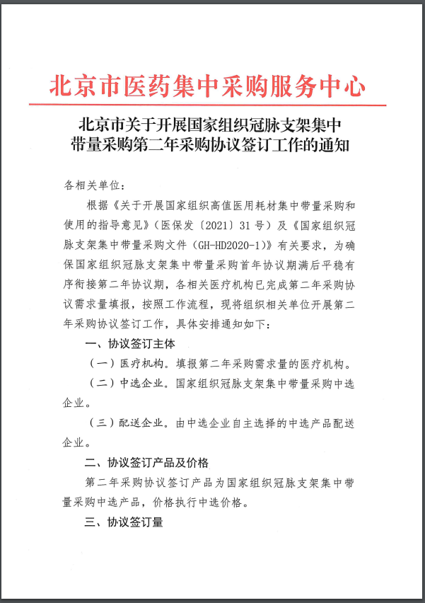 北京市关于开展国家组织冠脉支架集中带量采购第二年采购协议签订工作的通知