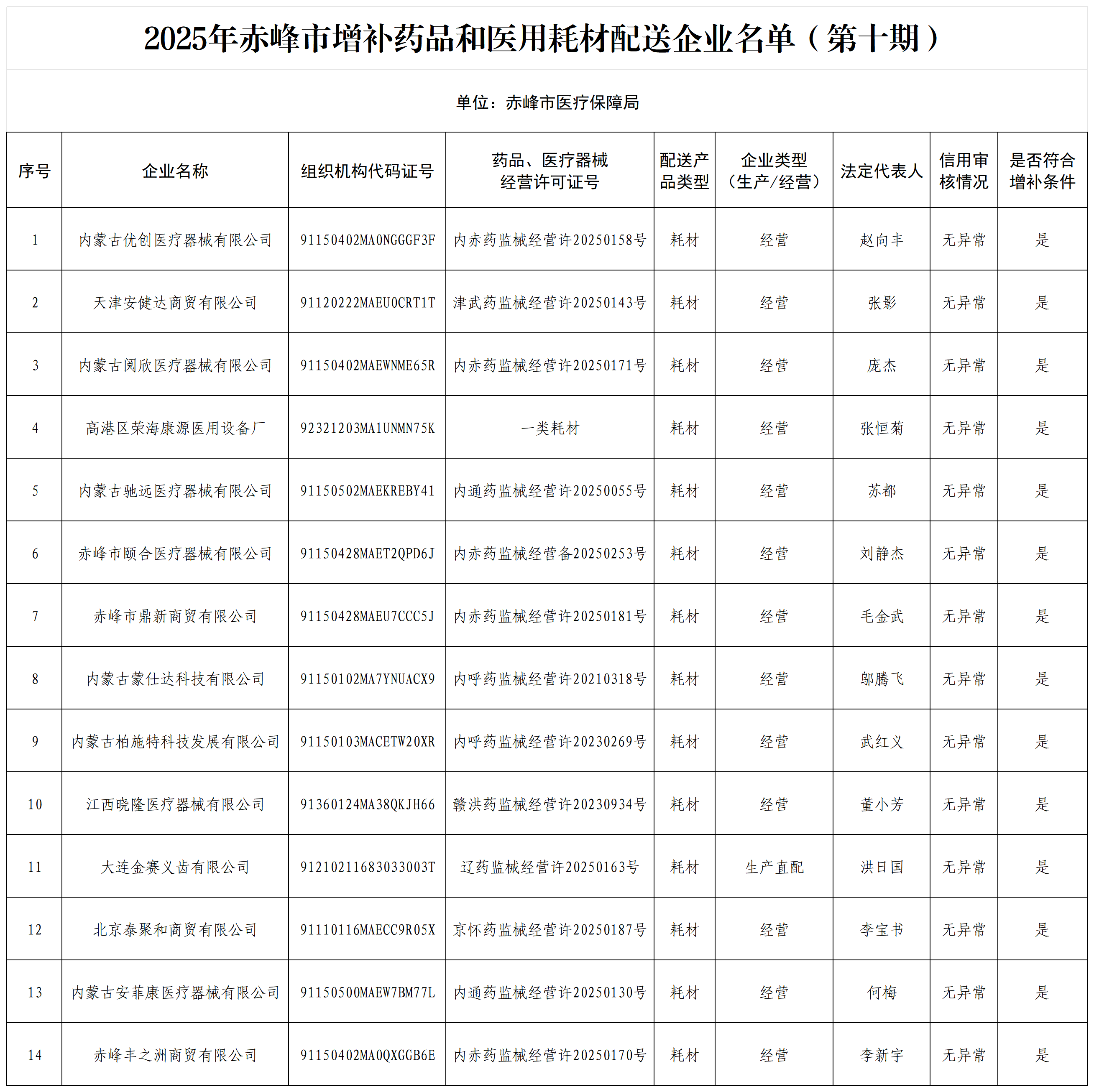 2025年赤峰市增补药品和医用耗材配送企业名单(第十期)