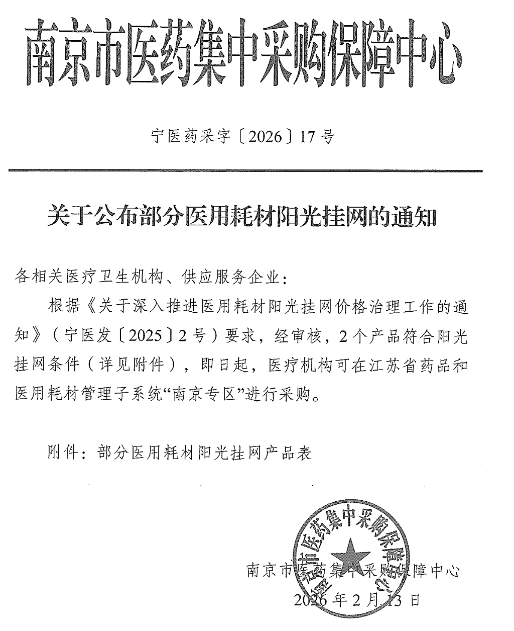 宁医药采字〔2026〕17号—关于公布部分医用耗材阳光挂网的通知