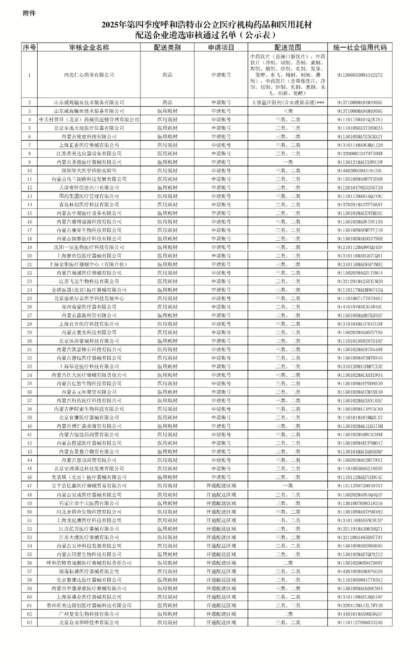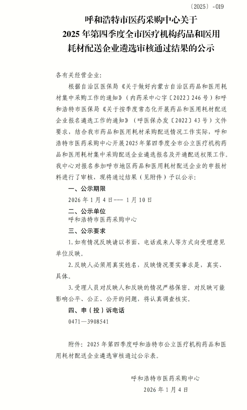 呼和浩特市医药采购中心关于2025年第四季度全市医疗机构药品和医用耗材配送企业遴选审核通过结果的公示
