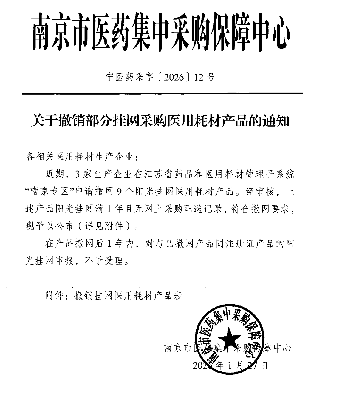 宁医药采字〔2026〕12号关于撤销部分挂网采购医用耗材产品的通知