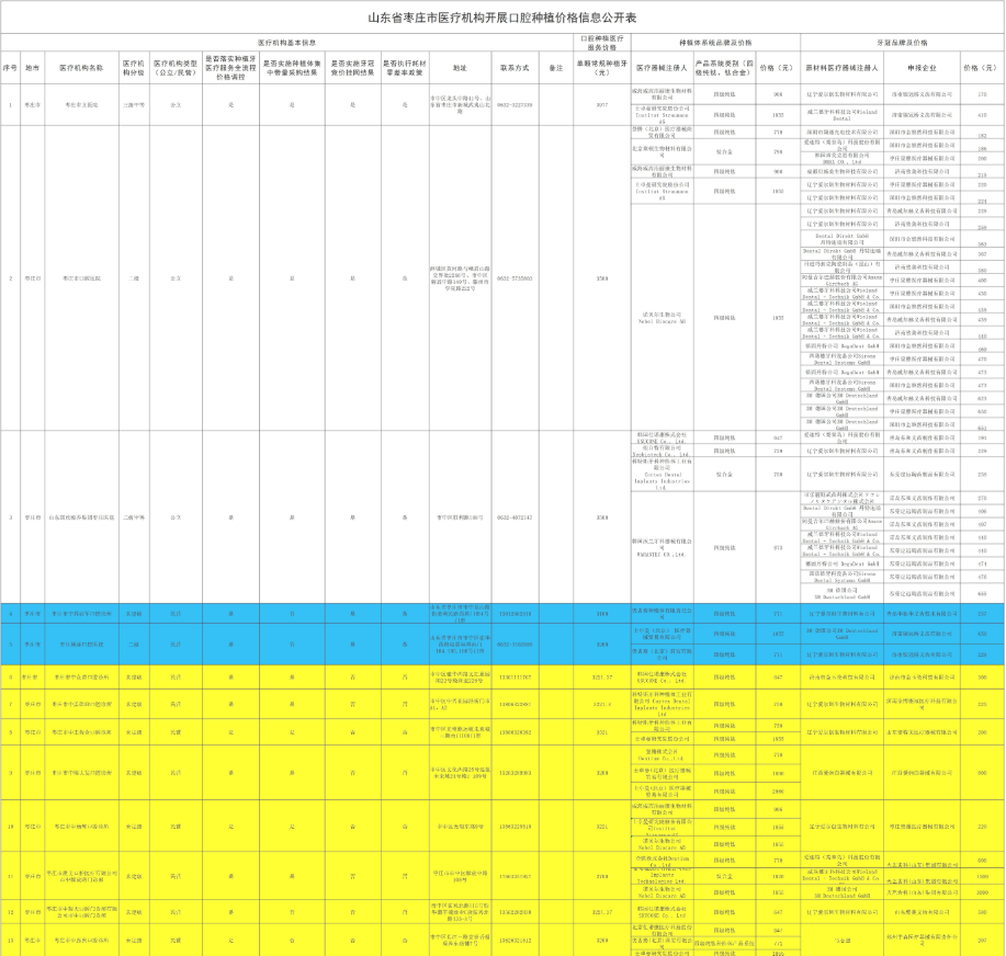 枣庄市参与口腔种植价格治理医疗机构有关信息情况表
