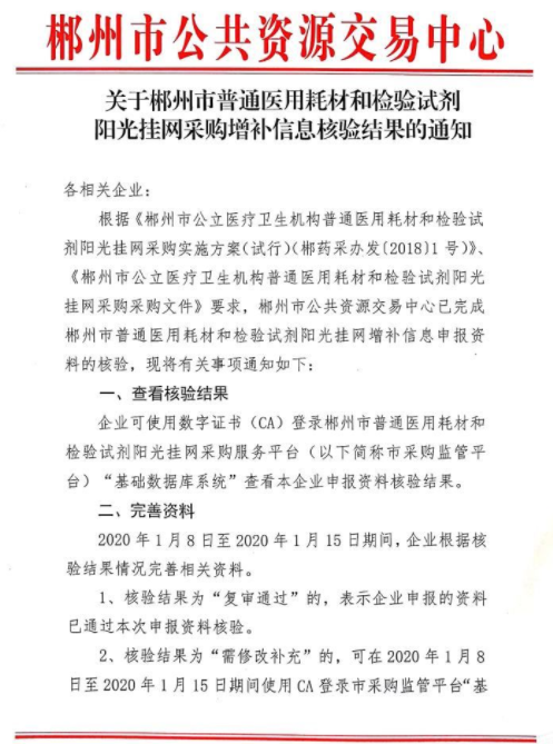 关于湖南省郴州市普通医用耗材和检验试剂阳光挂网采购增补信息核验结果的通知(2020.01.08)