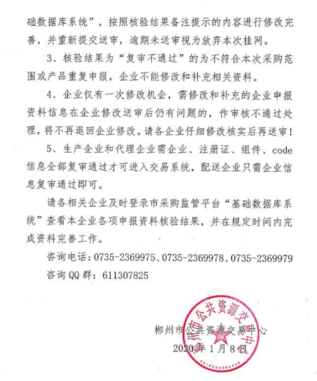 各相关企业: 根据《郴州市公立医疗卫生机构普通医用耗材和检验试剂阳光挂网采购实施方案(试行)(郴药采办发(2018)1号)》、《郴州市公立医疗卫生机构普通医用耗材和检验试剂阳光挂网采购采购文件》要求,郴州市公共资源交易中心已完成郴州市普通医用耗材和检验试剂阳光挂网增补信息申报资料的核验,现将有关事项通知如下: 一、查看核验结果 企业可使用数字证书(CA) 登录郴州市普通医用耗材和检验试剂阳光挂网采购服务平台(以下简称市采购监管平台)“基础数据库系统” 查看本企业申报资料核验结果。 二、完善资料 2020年1月8日至2020年1月15日期间,企业根据核验结果情况完善相关资料。. 1、核验结果为“复审通过”的,表示企业申报的资料已通过本次申报资料核验。 2、核验结果为“需修改补充”的,可在2020年1月8日至2020年1月15日期间使用CA登录市采购监管平台“基础数据库系统”,按照核验结果备注提示的内容进行修改完善,并重新提交送审,逾期未送审视为放弃本次挂网。 3、核验结果为“复审不通过”的为不符合本次采购范围或产品重复申报,企业不能修改和补充相关资料。 4、企业仅有一次修改机会,需修改和补充的企业申报资料信息在企业修改送审后仍有问题的,作审核不通过处理,将不再退回企业修改。请各企业仔细修改核实后再送审! 5、生产企业和代理企业需企业、注册证、组件、code信息全部复审通过才可进入交易系统,配送企业只需企业信息复审通过即可。 请各相关企业及时登录市采购监管平台“基础数据库系统http://47.93.213.242:8013/”查看本企业各项申报资料核验结果,并在规定时间内完成资料完善工作。 咨询电话: 0735- -2369975.0735- 2369978、0735- 2369979咨询QQ群: 611307825 郴州市公共资源交易甲心 2020年1月8日