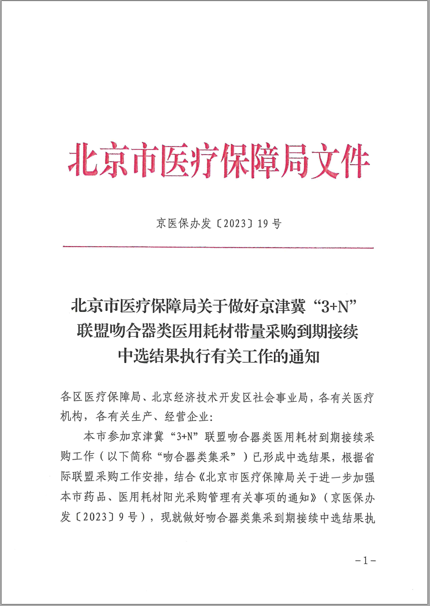 本市参加京津冀“3+N” 联盟吻合器类医用耗材到期接续采 购工作(以下简称“吻合器类集采”)已形成中选结果,根据省 际联盟采购工作安排,结合《北京市医疗保障局关于进一步加强 本市药品、医用耗材阳光采购管理有关事项的通知》(京医保办 发〔2023〕9号),现就做好吻合器类集采到期接续中选结果执行有关工作通知如下: