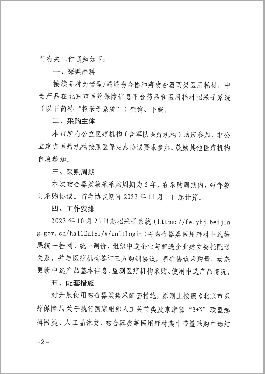 2023年10月23日起招采子系统(https://fw.ybj.beijing.gov.cn/hal1Enter/#/unitLogin)将吻合器类医用耗材中选结 果统一挂网、统一调价,组织中选企业与配送企业建立委托配送 关系,并与医疗机构签订三方购销协议,明确协议采购量,动态 更新中选产品基本信息,监测医疗机构采购、使用中选产品情况。