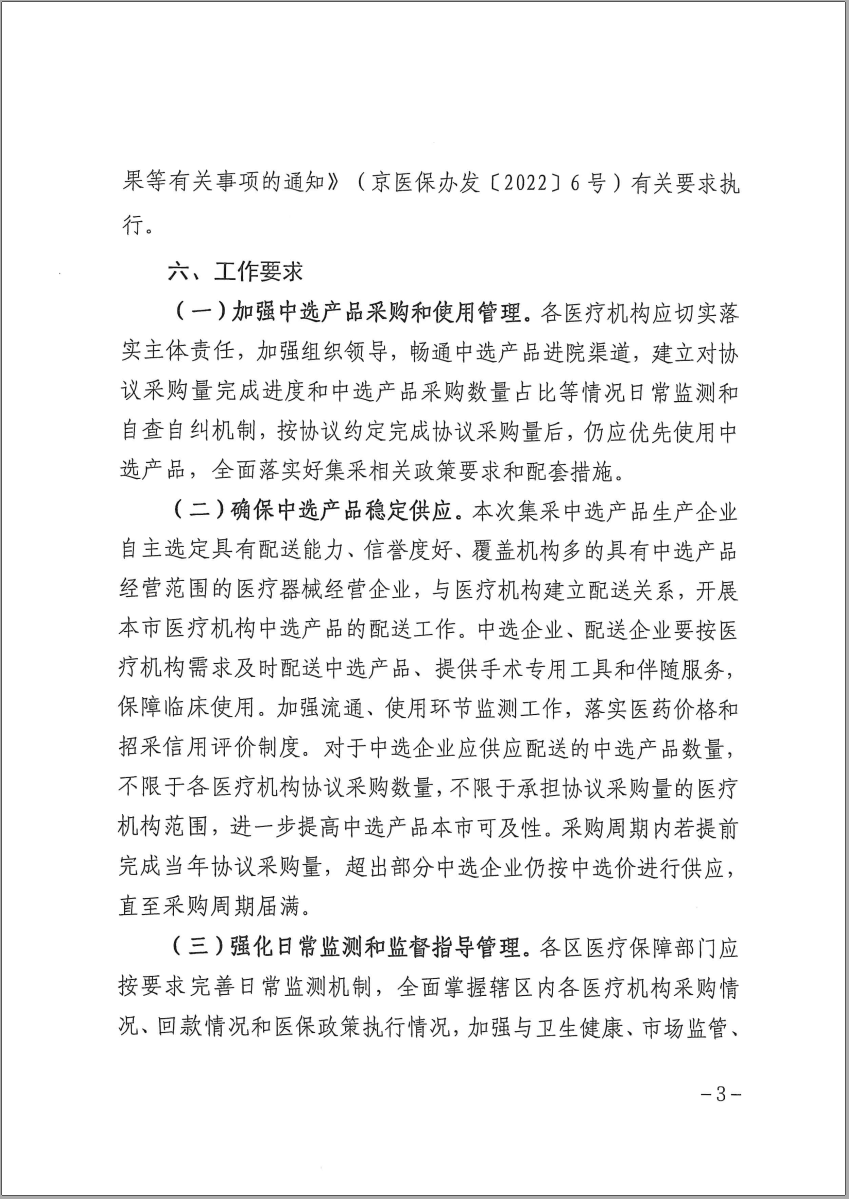 对开展使用吻合器类集采配套措施,原则上按照《北京市医 疗保障局关于执行国家组织人工关节类及京津冀“3+N”联盟起搏器类、人工晶体类、吻合器类等医用耗材集中带量采购中选结果等有关事项的通知》(京医保办发〔2022〕6号)有关要求执行。