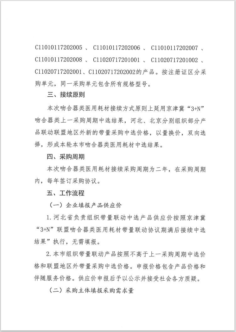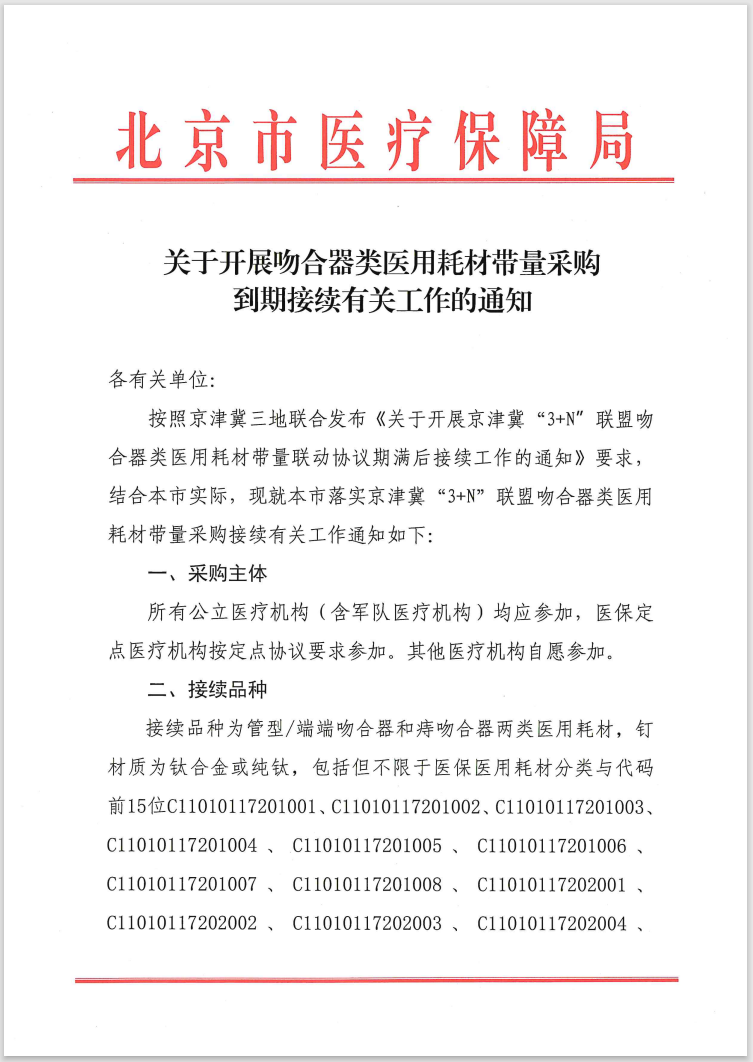按照京津冀三地联合发布《关于开展京津冀“3+N”联盟吻合器类医用耗材带量联动协议期满后接续工作的通知》要求,结合本市实际,现就本市落实京津冀“3+N”联盟吻合器类医用耗材带量采购接续有关工作通知如下: