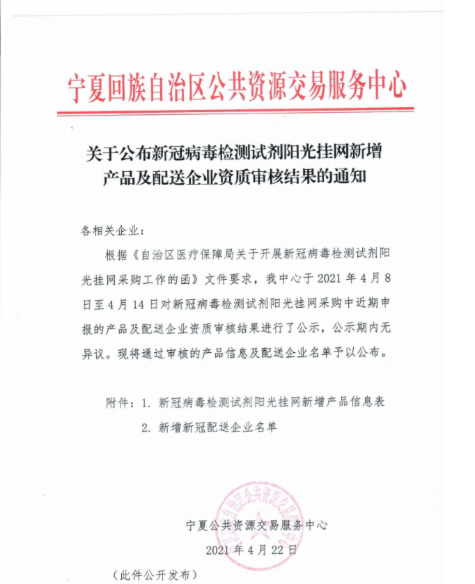 关于公布新冠病毒检测试剂阳光挂网新增产品及配送企业资质审核结果的通知