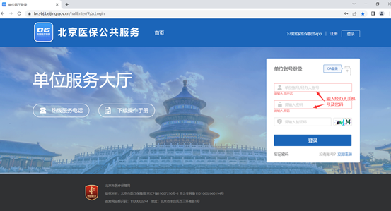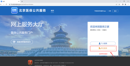 插好CA证书并完成招采系统业务环境准备工作后,在医保公服页面(https://fw.ybj.beijing.gov.cn/hallEnter/#/index)点击“单位登录”,使用已注册的经办人账号进行登入。