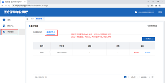 登录单位账号完成经办人的维护