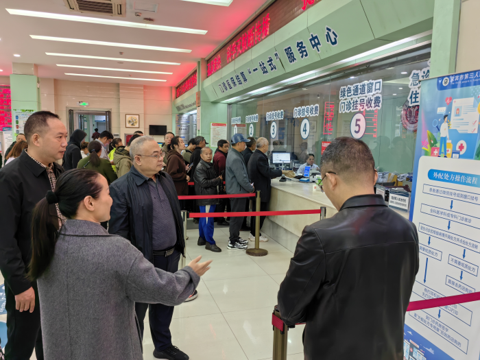 在宜宾市第三人民医院,余小洋一行实地察看医保药品外配方管理政策宣传、服务流程、便民门诊、就医引导等情况,到医院便民门诊,亲历了就诊、医保医师开具外配处方、医保药师审核、电子外配处方上传至医保电子处方流转平台等流程。随后,余小洋一行来到四川一心堂医药连锁有限公司将军街店,体验门诊统筹定点零售药店购药、报销等结算流程,同药店药师、服务人员等进行交流。每到一处,都同医院和药店负责人就当前政策落实过程中存在的困难和问题进行沟通和交流。