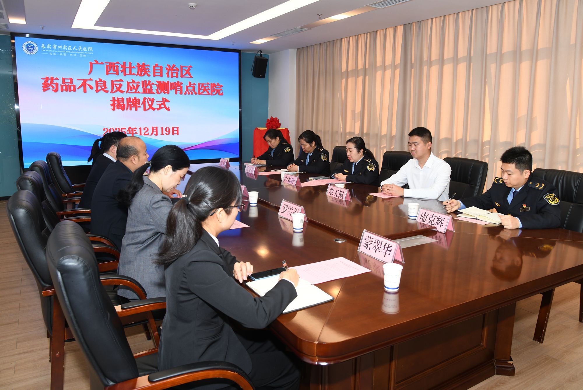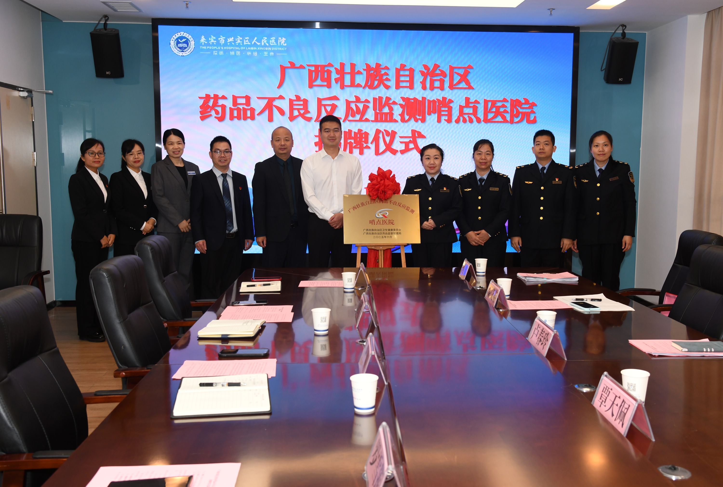 来宾市市场监管局药品科、兴宾区市场监管局及相关药械监管负责人,两家医院相关科室负责人共同参加了揭牌仪式及研讨活动。