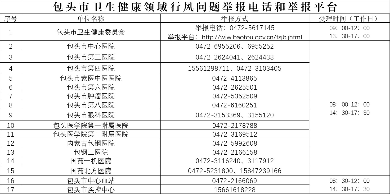 为进一步加强全市卫生健康领域行风建设,整治全市医药领域腐败问题,现将全市卫生健康领域行风问题举报电话和举报平台予以公布: