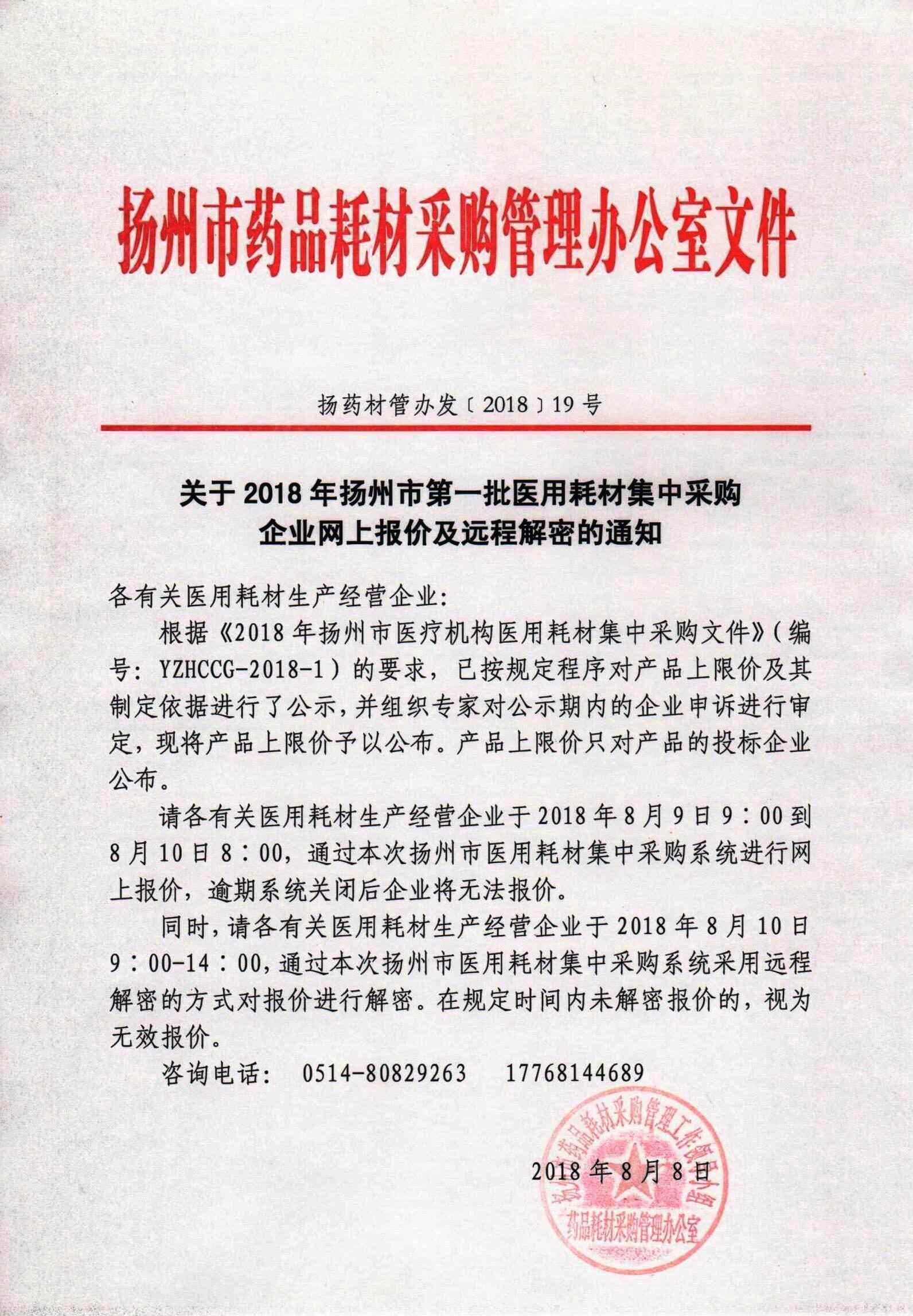 2018年江苏省扬州市第一批医用耗材集中采购企业网上报价及远程解密的通知