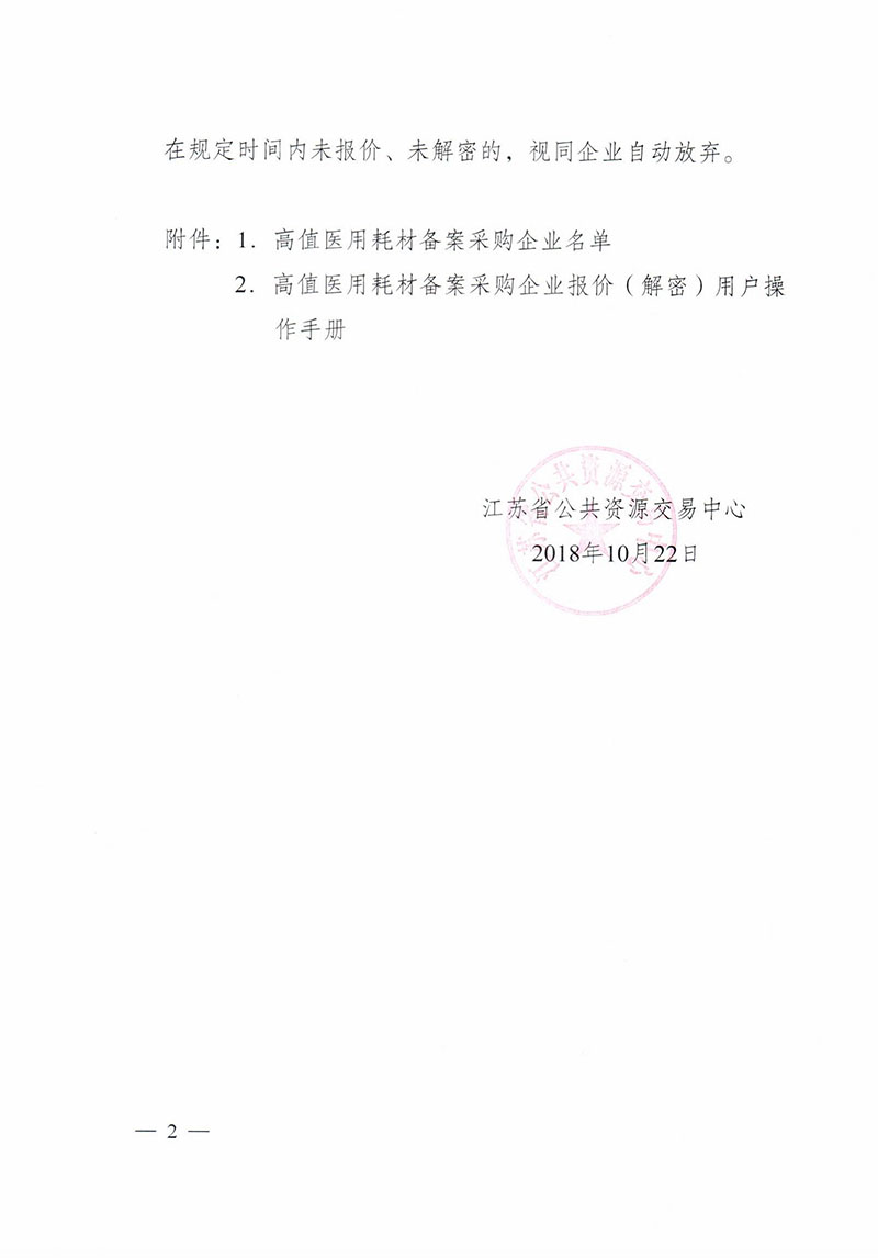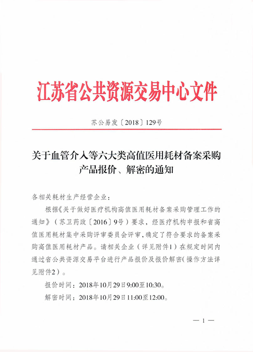 关于江苏省血管介入等六大类高值医用耗材备案产品报价、解密的通知