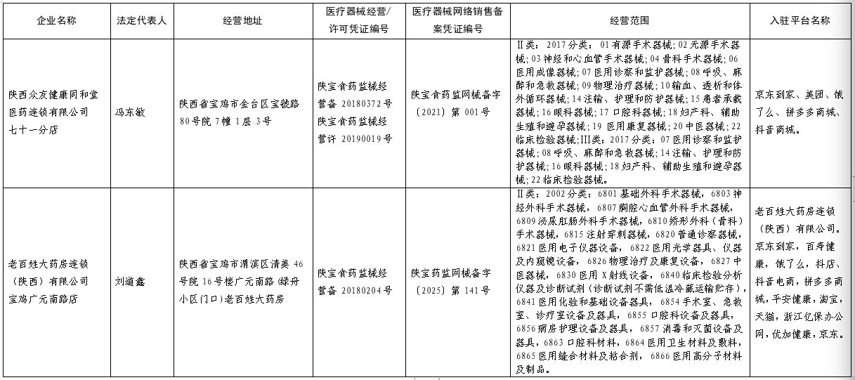 根据《医疗器械监督管理条例》《医疗器械经营监督管理办法》和《医疗器械网络销售监督管理办法》等规定,现对陕西众友健康同和堂医药连锁有限公司七十一分店等2家企业的医疗器械网络销售备案信息予以公示(首次备案)。
