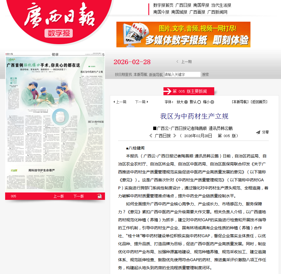 如何全面提升广西中药产业核心竞争力、产业成长力、市场感召力、服务保障力?《意见》紧扣广西中医药产业升级需要大作文章。相关负责人介绍,以广西道地药材规范化种植(养殖)为抓手,建立对中药材GAP的实施进行检查和开展技术指导的工作机制,引导中药材生产企业、国有林场或具有企业性质的种植(养殖)合作社、“桂十味”等中药材建设单位积极实施中药材GAP,督促企业落实主体责任,以优化品种、提升品质、打造品牌为目标,促进广西中医药产业高质量发展。同时,制定优化中药材产业布局、加强种源基地建设、规范种植养殖、规范采收加工、建立追溯体系、规范延伸检查、鼓励优先使用符合GAP的药材、推进集采评价激励八项工作任务,构建起从地头到药房的全流程质量管理制度闭环。
