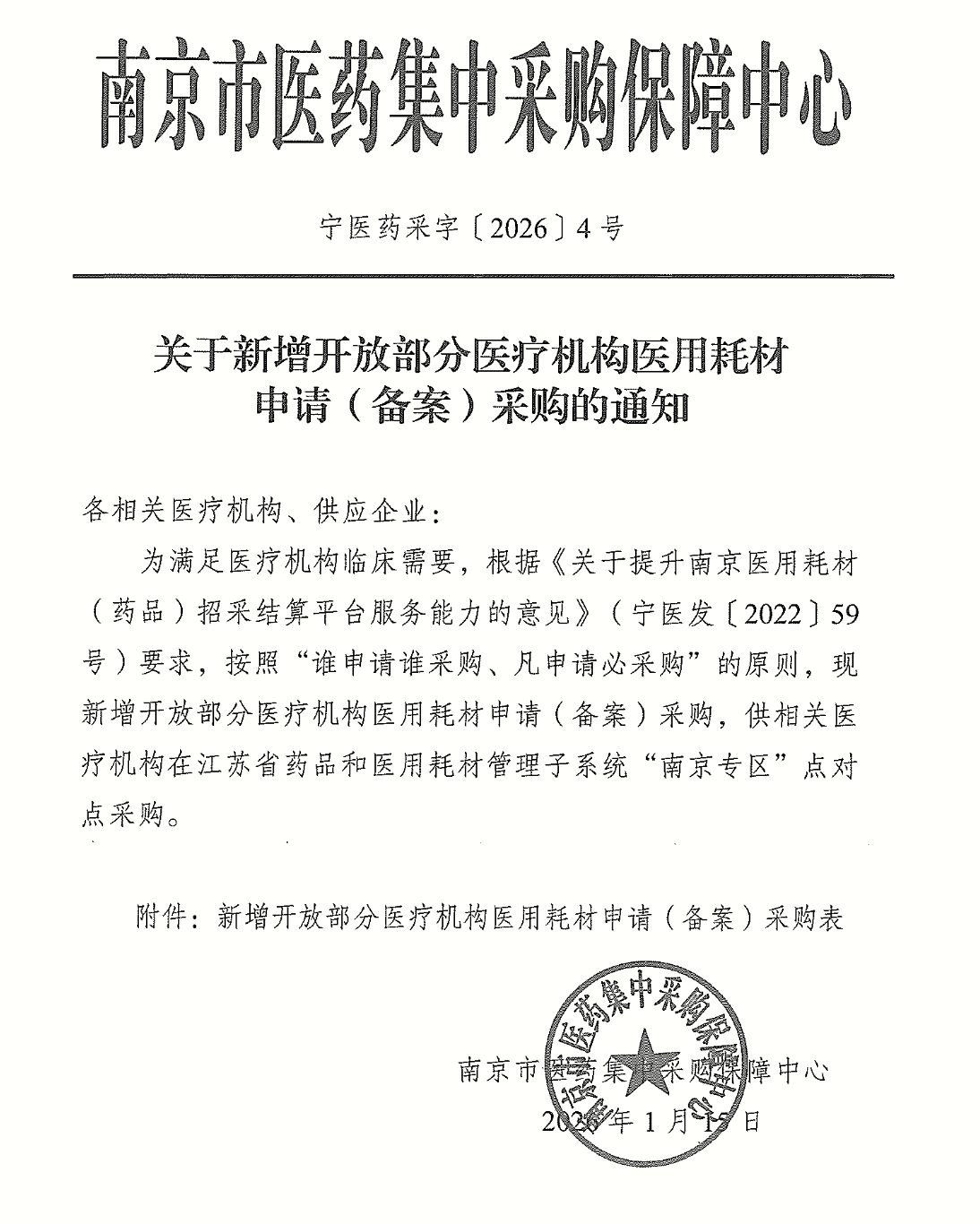 宁医药采字〔2026〕4号—关于新增开放部分医疗机构医用耗材申请(备案)采购的通知