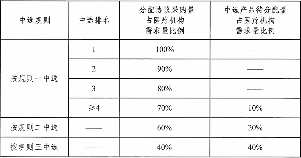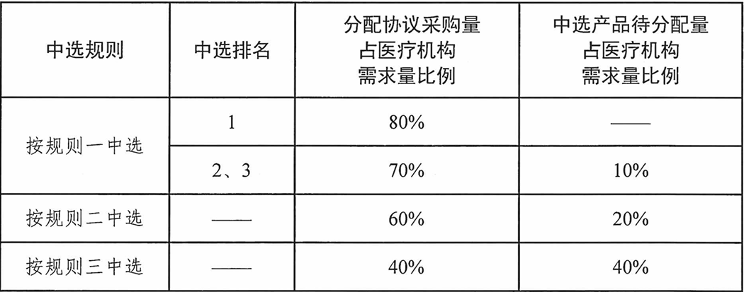 第一步:竞价单元内按中选规则及中选排名,梯度分配协议采购量,如出现非整数则向上取整至个位,详见表1。