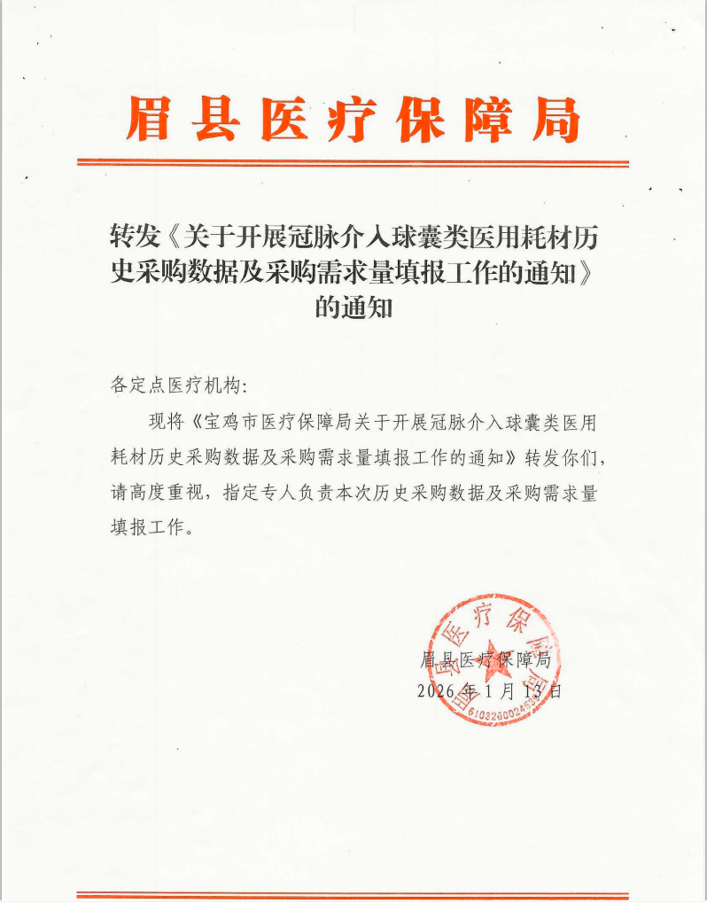 现将《宝鸡市医疗保障局关于开展冠脉介入球囊类医用耗材历史采购数据及采购需求量填报工作的通知》转发你们,请高度重视,指定专人负责本次历史采购数据及采购需求量填报工作。