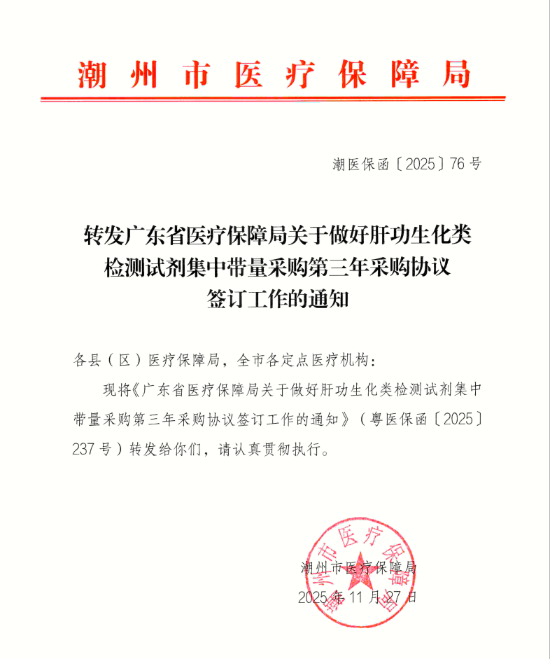 各县(区)医疗保障局,全市各定点医疗机构: 现将《广东省医疗保障局关于做好肝功生化类检测试剂集中带量采购第三年采购协议签订工作的通知》(粤医保函〔2025〕237号)转发给你们,请认真贯彻执行。