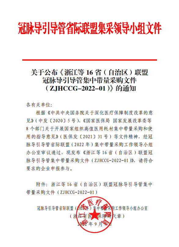 关于公布《浙江等16省(自治区)联盟冠脉导引导管集中带量采购文件(ZJHCCG-2022-01)》的通知