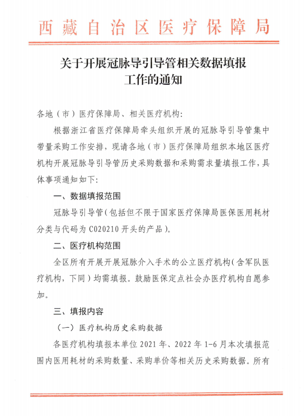 西藏自治区关于开展冠脉导引导管相关数据填报工作的通知