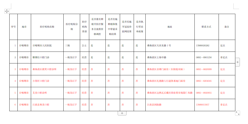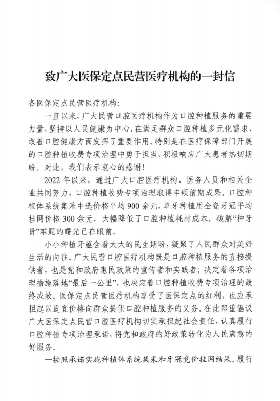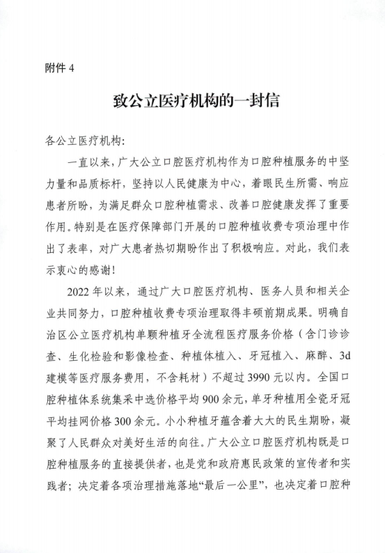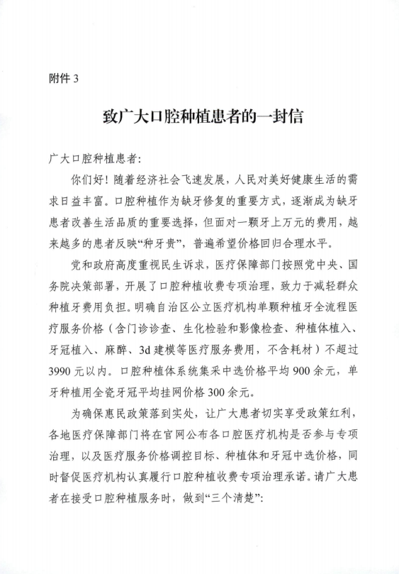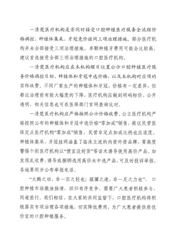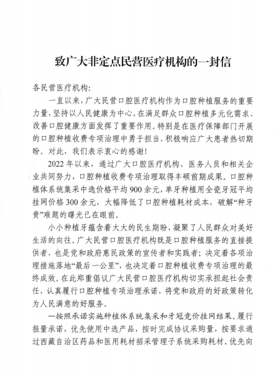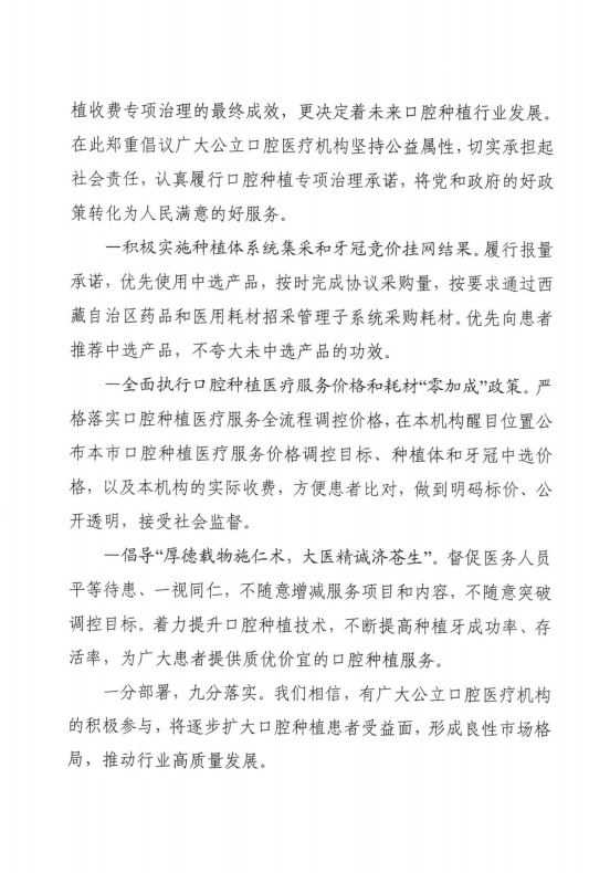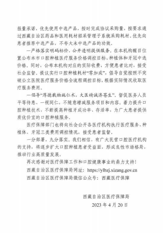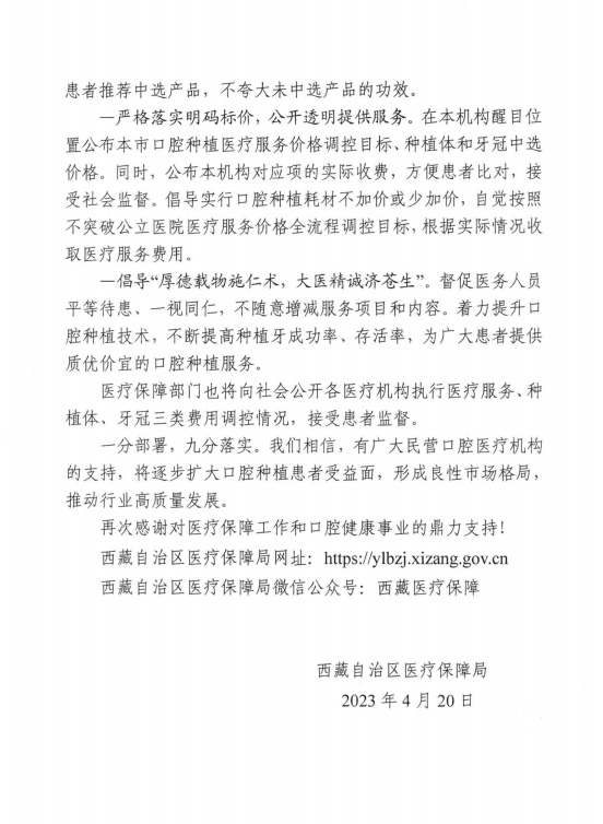 根据《西藏自治区医疗保障局关于做好口腔种植价格专项治理有关工作的通知》(藏医保[2023]27号)文件精神,我区口腔种植价格开展专项治理活动,从2023年4月20日起执行《口腔种植体系统省际聪明集中带量采购中选品种清单》、《口腔牙冠竞价挂网拟入围结果》,采购周期为3年。同时确定我区公立医疗机构单颗常规种植医疗服务价格不超过3990元,我市严格规范医疗机构收费行为,实行医疗服务、种植体,牙冠公开收费,明码标价。现将我市已开展口腔种植的医疗机构名单进行公布如下:
