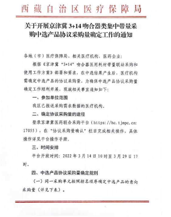 关于开展京津冀3+14吻合器类集中带量采购中选产品协议采购量确定工作的通知