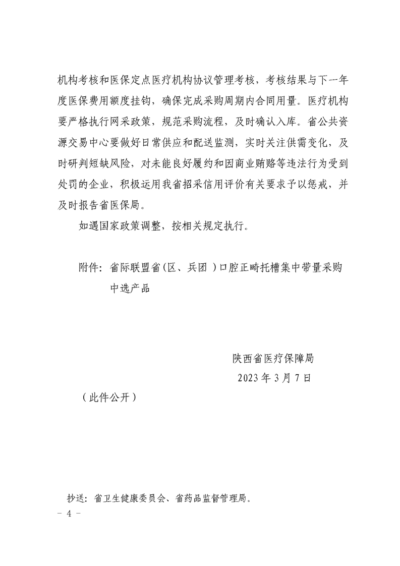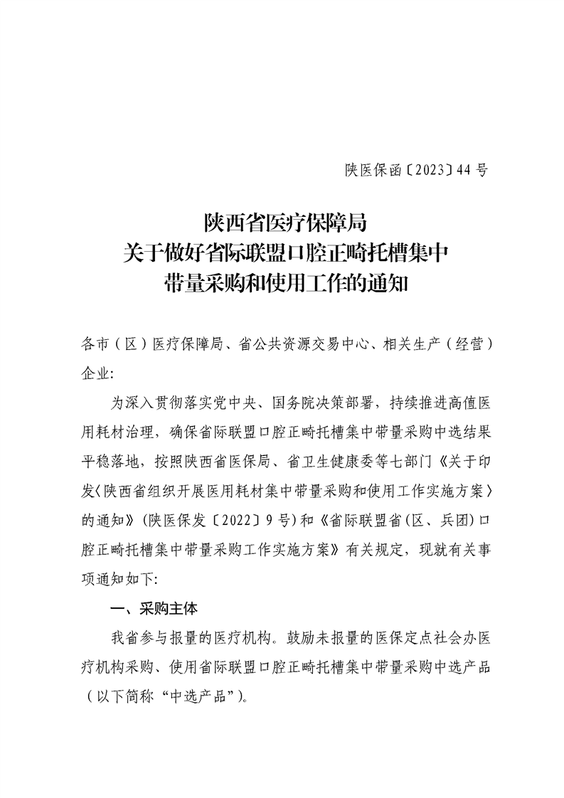 为深入贯彻落实党中央、国务院决策部署,持续推进高值医 用耗材治理,确保省际联盟口腔正畸托槽集中带量采购中选结果 平稳落地,按照陕西省医保局、省卫生健康委等七部门《关于印 发〈陕西省组织开展医用耗材集中带量采购和使用工作实施方案〉 的通知》(陕医保发〔2022〕9号)和《省际联盟省(区、兵团)口 腔正畸托槽集中带量采购工作实施方案》有关规定,现就有关事