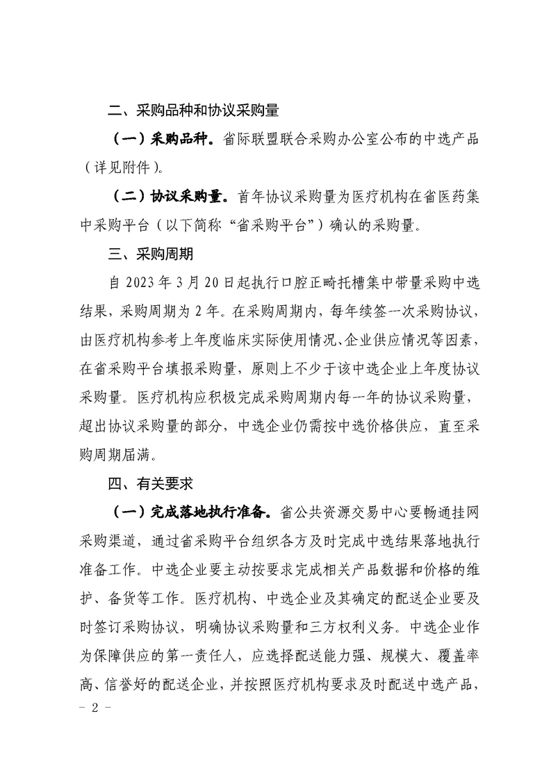 自2023年3月20日起执行口腔正畸托槽集中带量采购中选 结果,采购周期为2年。在采购周期内,每年续签一次采购协议, 由医疗机构参考上年度临床实际使用情况、企业供应情况等因素, 在省采购平台填报采购量,原则上不少于该中选企业上年度协议 采购量。医疗机构应积极完成采购周期内每一年的协议采购量, 超出协议采购量的部分,中选企业仍需按中选价格供应,直至采购周期届满。