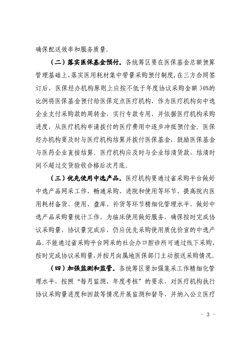 (四)加强监测和监管。 各统筹区要加强集采工作精细化管 理水平,按照“每月监测、年度考核”的要求,对医疗机构执行协议采购量进度和回款等情况开展监测和督导,并纳入公立医疗机构考核和医保定点医疗机构协议管理考核,考核结果与下一年 度医保费用额度挂钩,确保完成采购周期内合同用量。医疗机构 要严格执行网采政策,规范采购流程,及时确认入库。省公共资 源交易中心要做好日常供应和配送监测,实时关注供需变化,及 时研判短缺风险,对未能良好履约和因商业贿赂等违法行为受到 处罚的企业,积极运用我省招采信用评价有关要求予以惩戒,并