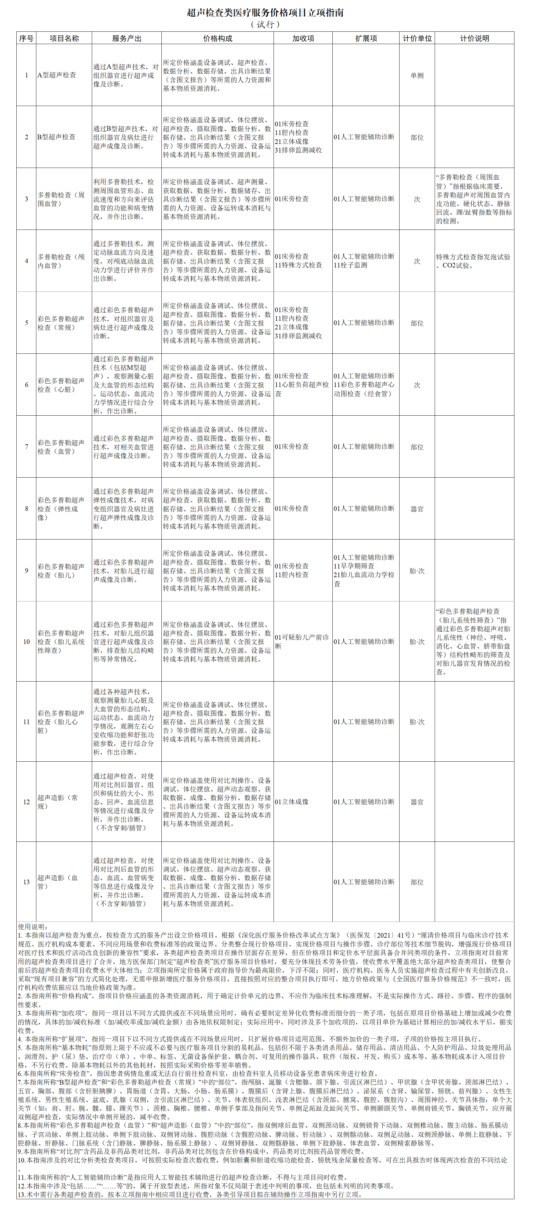 编制说明:为贯彻落实《深化医疗服务价格改革试点方案》,推进全国医疗服务价格项目规范编制工作,按照“成熟一批、发布一批”的工作思路,国家医保局组织编制了《超声检查类医疗服务价格项目立项指南(试行)》,参考2023年版医疗服务项目技术规范,将现行超声检查类价格项目映射整合为13项,供各省医保局参考,结合实际做好对接落实,制定全省统一的价格基准,由具有价格管理权限的统筹地区对照全省价格基准,上下浮动确定实际执行的价格水平。