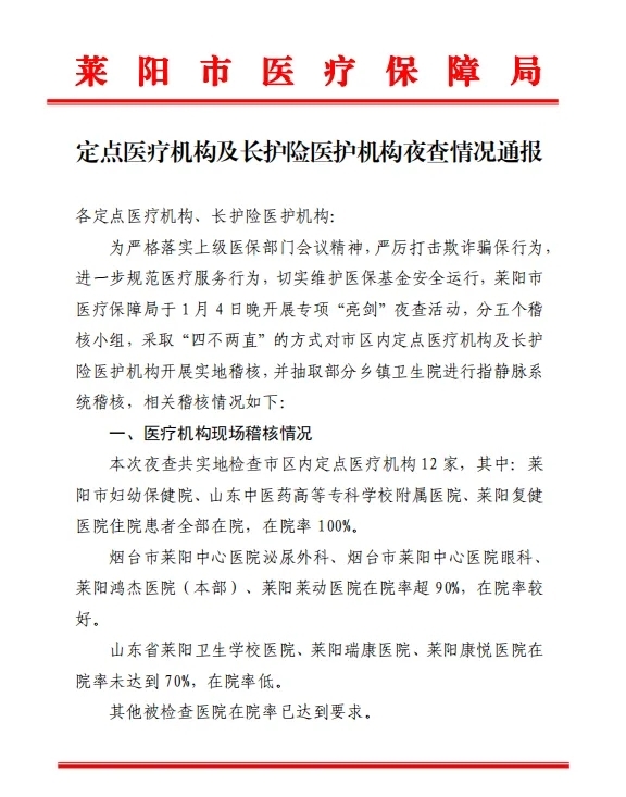 为严格贯彻落实省烟医保工作精神,进一步规范医疗服务行为,严打欺诈骗保行为,守好老百姓的“救命钱”,切实维护好医保基金安全。1月4日晚,市医保部门抽调精干稽核力量,组成5个检查组,采取“不发通知、不打招呼、不定路线、直入病房”的方式,对城区12家定点医疗机构和4家长护定点医护机构开展了实地“大夜查”行动,同时对18家乡镇卫生院住院患者在院情况进行了指静脉系统稽核。
