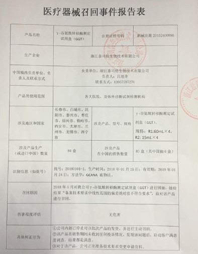 浙江泰司特生物技术有限公司报告,由于在国家医疗器械监督抽检中该产品备案技术要求中线性范围的偏差绝对值不符合要求,浙江泰司特生物技术有限公司对其生产的γ-谷氨酰转移酶测定试剂盒(GGT)(注册证号:浙械注准20152400880)主动召回。召回级别为三级。涉及产品的型号、规格及批次等详细信息见《医疗器械召回事件报告表》。