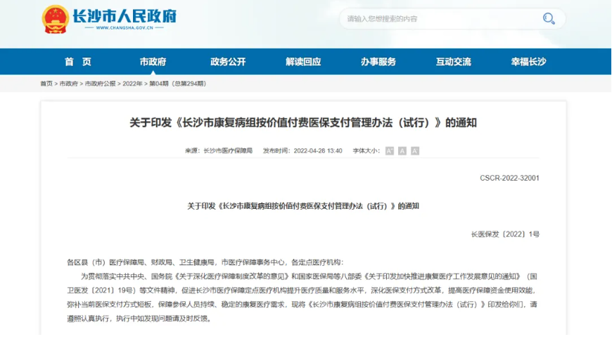 2022年4月,长沙市医疗保障局率先推出“康复病组按价值付费(FRG)”这一全新的医保支付方式,纳入颅内出血性疾患、脑缺血性疾患-梗死型等15个康复病组,覆盖疾病康复全周期,强调恢复患者的功能,鼓励医疗机构注重治疗效果。该举措降低了患者的医疗费用负担,提升了医保资金使用效率,实现了“医、患、保”三方共赢。