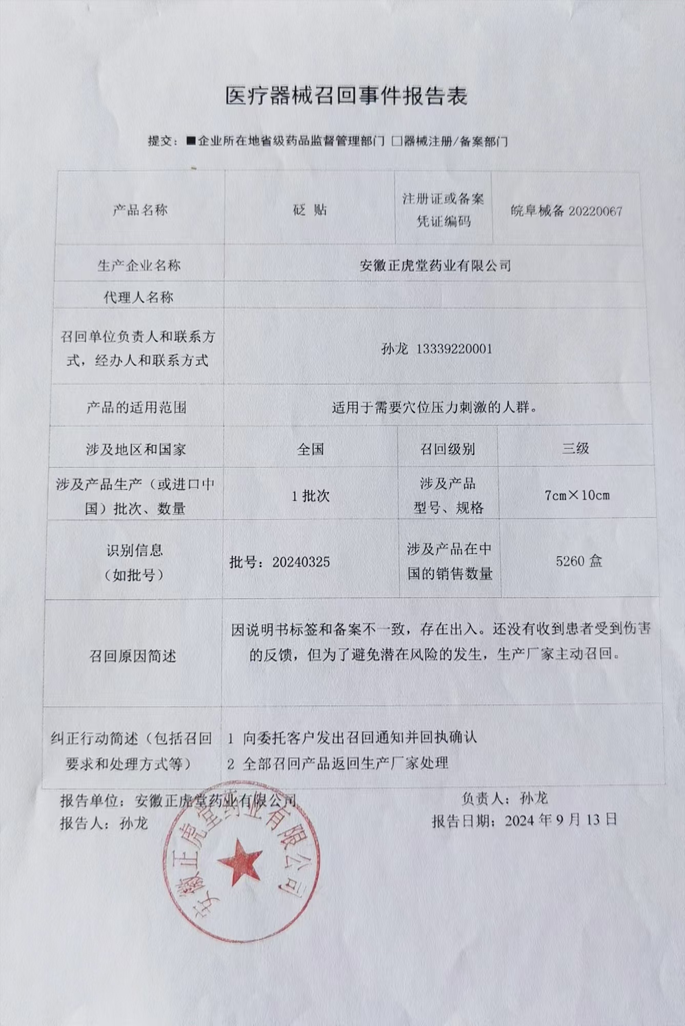 安徽正虎堂药业有限公司报告:批号为20240325的砭贴说明书、标签和备案信息不一致,安徽正虎堂药业有限公司对其生产的批号为20240325的砭贴主动召回,召回级别为三级,涉及产品型号规格及批次等详细信息见医疗器械召回事件报告表。