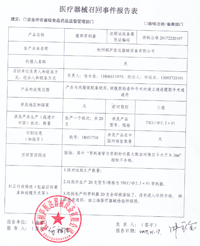 杭州桐庐医达器械设备有限公司报告,由于在国家医疗器械监督抽检中穿刺套管与穿刺针的最大配合间隙指标不符合要求,杭州桐庐医达器械设备有限公司对其生产的腹部穿刺器(注册证号:浙械注准20172220107)主动召回。召回级别为三级。涉及产品的型号、规格及批次等详细信息见《医疗器械召回事件报告表》。
