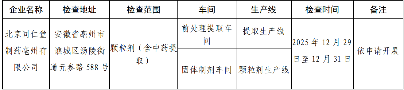 根据《中华人民共和国药品管理法》《药品注册管理办法》《药品生产监督管理办法》等有关规定,北京同仁堂制药亳州有限公司申请新建前处理提取车间提取生产线、固体制剂车间颗粒剂生产线[颗粒剂(含中药提取)]药品GMP符合性检查,我局于2025年12月29日至12月31日依申请对北京同仁堂制药亳州有限公司开展了药品GMP符合性检查。经现场检查并综合评定,本次依申请开展的药品GMP符合性检查结论为符合要求,现予以公告。
