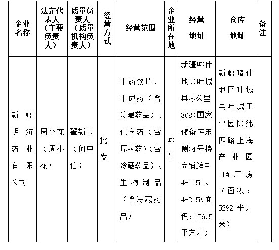 新疆明济药业有限公司申请核发《药品经营许可证》,按照法定程序经检查验收,符合《药品经营和使用质量监督管理办法》(国家市场监督管理总局令第84号)《食品药品监管总局关于修订印发〈药品经营质量管理规范现场检查指导原则〉有关事宜的通知》(食药监药化监[2016]160号)、关于印发《新疆维吾尔自治区药品现代物流规范建设实施细则(试行)》《新疆维吾尔自治区药品第三方物流规范建设实施细则(试行)》(新药监规〔2024〕5号)的通知等相关要求,现予以公示,请社会各界予以监督。