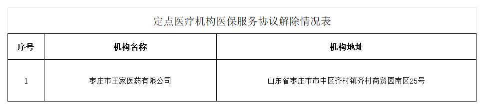 根据《医疗机构医疗保障定点管理暂行办法》(国家医疗保障局令第2号)和《零售药店医疗保障定点管理暂行办法》(国家医疗保障局令第3号)以及医疗机构医保服务协议相关规定,遵循《关于印发《枣庄市基本医疗保险定点医疗机构服务协议管理经办规程》的通知》(枣医保中心发【2022】6号)要求,枣庄市王家医药有限公司因个人原因向市中区市经办机构提出解除申请,经市中区经办机构审核,决定解除上述1家定点机构医保服务协议。